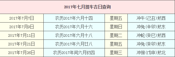 2017年7月提车吉日宜忌: