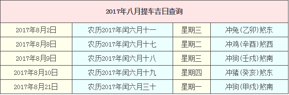 2017年8月提车黄道吉日一览表: