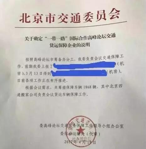 “一带一路”国际合作高峰论坛期间,四通搬家共服务了34个国家和国际组织代表团,出色的完成了货运保障任务。