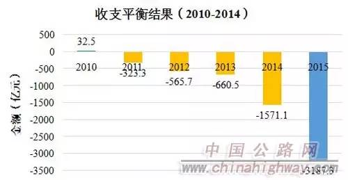 而上述公报显示,目前中国公路建设可能是处于供大于求的局面。从2010年以来,中国收费公路的收支从盈余变为负数,更为重要的是,收入和支出的差距在不断扩大:在2010年尚能盈余32.5亿元,但是到了2015年则亏损3187.3亿元,而且这两年的缺口都成倍增加。据统计,从2010年至2014年,收费公路的收支平衡结果依次为:32.5亿元、-323.3亿元、-565.7亿元、-660.5亿元和-1571.1亿元。