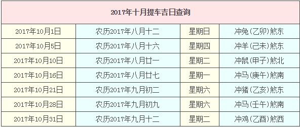 2017年10月提车吉日查询,2017年10月提车吉日一览表